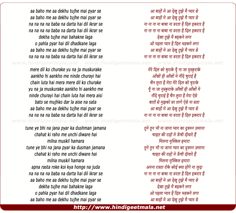 Lyrics of Aa Bahon Me Aa - आ बाहों मे आ