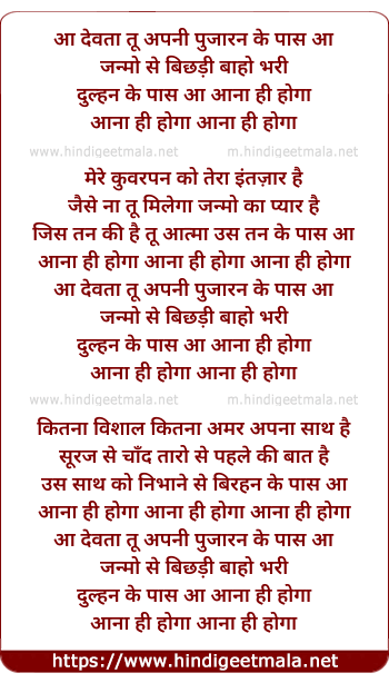 Lyrics of Aa Devta Tuh Apni Pujarin Ke Pas Aa - आ देवता तू अपनी पुजारन के पास आ