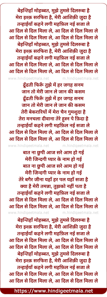 Lyrics of Aa Dil Se Dil Mila Le - आ दिल से दिल मिला ले