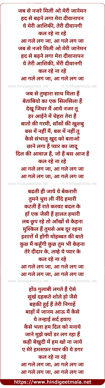 Lyrics of Aa Gale Lag Ja - आ गले लग जा