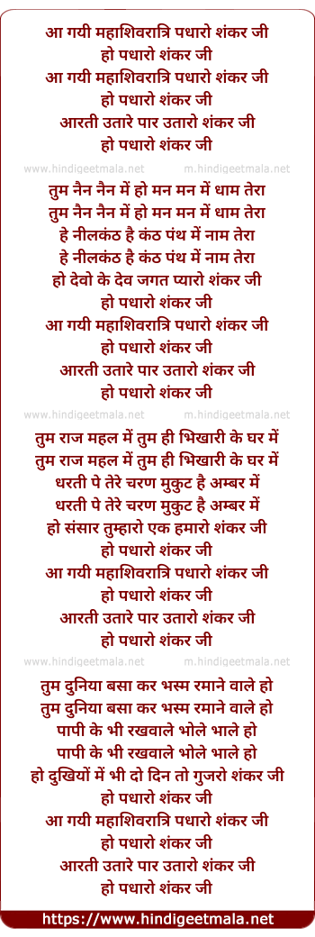 Lyrics of Aa Gayi Mahashivratri Padharo Shankar Ji - आ गयी महाशिवरात्रि पधारो शंकर जी