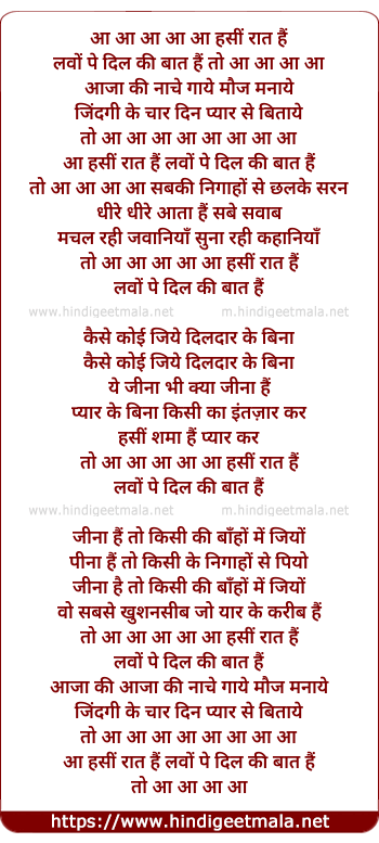 Lyrics of Aa Haseen Raat - आ हसीं रात