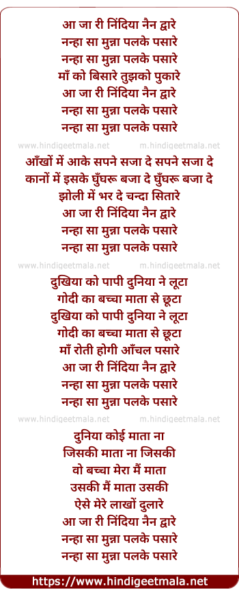 Lyrics of Aa Ja Re Nindiya Nain Dvare - आ जा रे निंदिया नैन द्वारे