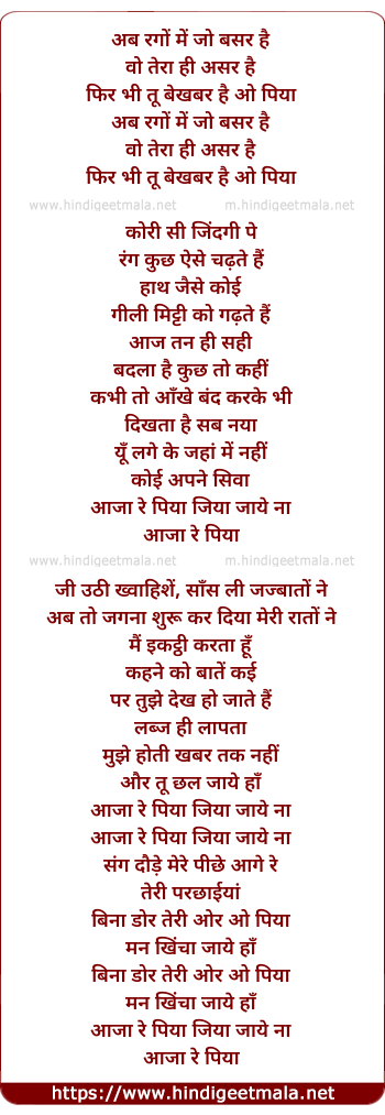 Lyrics of Aa Ja Re Piya (Sufi Version) - अब रगों में जो बसर है