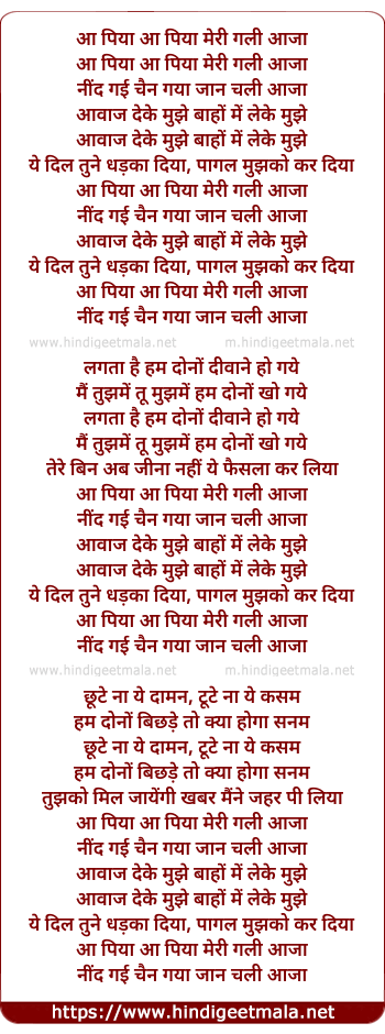Lyrics of Aa Piya Aa Piya Meri Gali Aaja - आ पिया आ पिया मेरी गली आजा