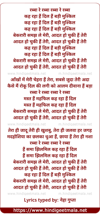 Lyrics of Aadat Ho Chuki (Remix) - रब्बा रे रब्बा रब्बा रे रब्बा