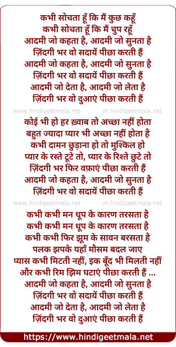 Lyrics of Kabhi Sochta Hu, Aadmi Jo Kahta Hai Aadmi Jo Sunta Hai - कभी सोचता हूँ, आदमी जो कहता है आदमी जो सुनता है