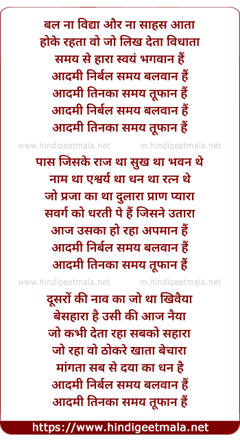 Lyrics of Aadmi Nirbal Samay Balwan Hai - आदमी निर्बल समय बलवान हैं