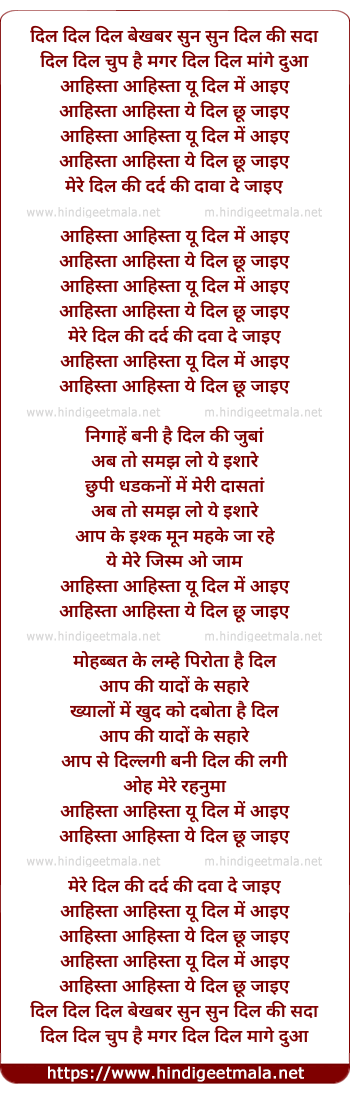 Lyrics of Aahista Aahista Yun Dil Mein Aaiye - आहिस्ता आहिस्ता यूँ दिल में आइये