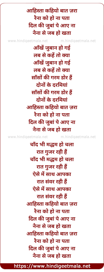 Lyrics of Aahista Kahiyo Baat Zara - आहिस्ता कहियो बात ज़रा
