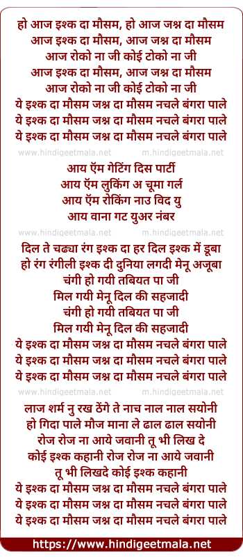 Lyrics of Aaj Ishq Da Mausam, Aaj Jashan Da Mausam - आज इश्क दा मौसम, आज जश्न दा मौसम