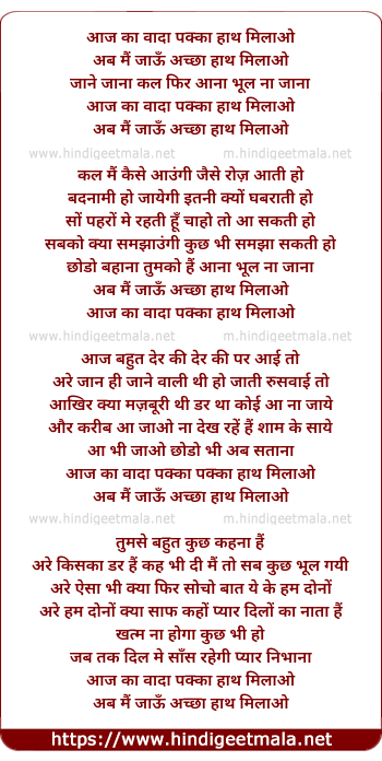 Lyrics of Aaj Ka Vada Pakka Hath Milao - आज का वादा पक्का हाथ मिलाओ