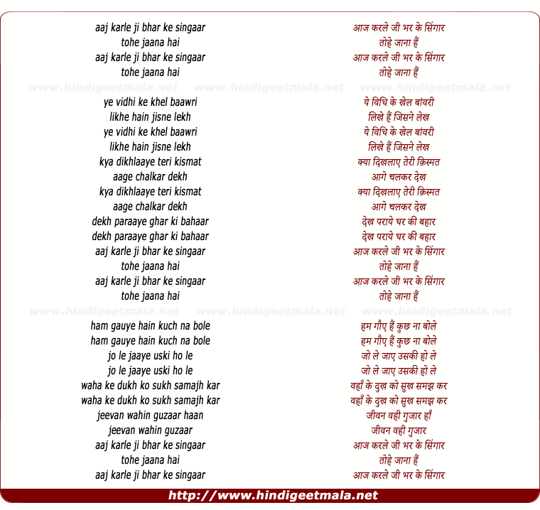 Lyrics of Aaj Kar Le Jee Bhar Ke Singar - आज करले जी भर के सिंगार