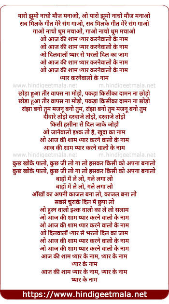 Lyrics of Aaj Ki Shaam Pyar Karne Walo Ke Naam - आज की शाम प्यार करने वालो के नाम