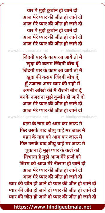 Lyrics of Aaj Mere Pyar Ki Jeet Ho Jane Do - आज मेरे प्यार की जीत हो जाने दो