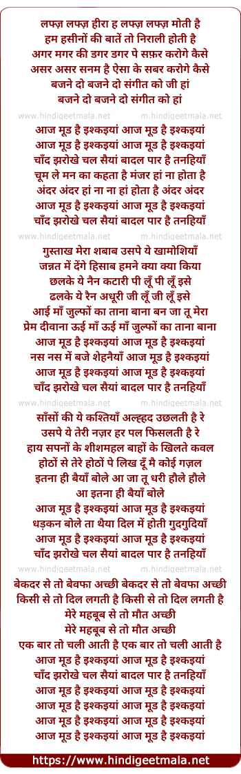 Lyrics of Aaj Mood Hai Ishqiyaan - आज मूड़ है इश्कियां
