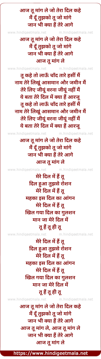 Lyrics of Aaj Tu Maang Le Jo Tera Dil Kahe - आज तू मांग ले जो तेरा दिल कहे