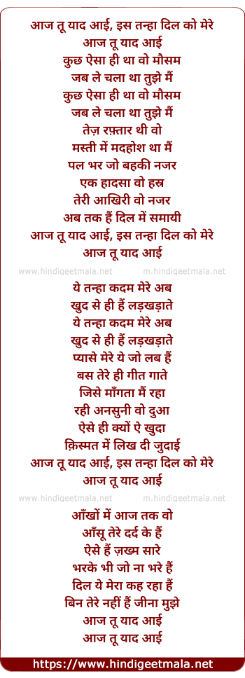 Lyrics of Aaj Tu Yaad Aayi - आज तू याद आई, इस तन्हा दिल को मेरे
