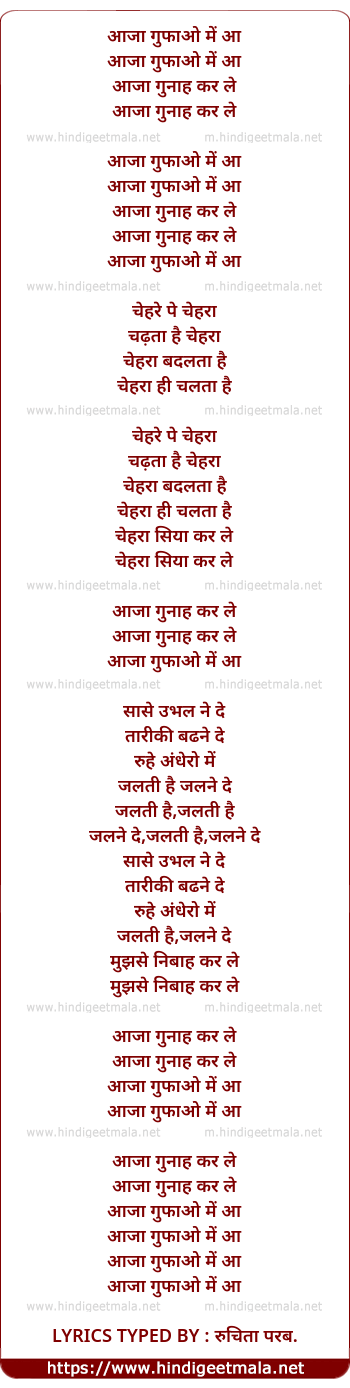 Lyrics of Aaja Gufao Me Aa - आजा गुफाओ में आ