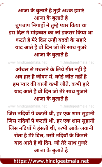 Lyrics of Aaja Ke Bulate Hain - आजा के बुलाते है