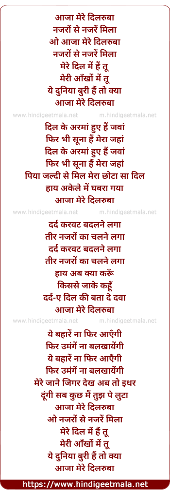 Lyrics of Aaja Mere Dilruba - आजा मेरे दिलरुबा