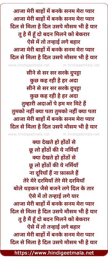 Lyrics of Aaja Meree Bahon Me Banke Sanam Meraa Pyaar - आजा मेरी बाहों में बनके सनम मेरा प्यार