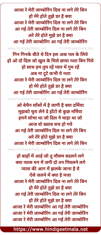 Lyrics of Aaja Re Meri Jaamboring - आजा रे मेरी जाम्बोरिंग