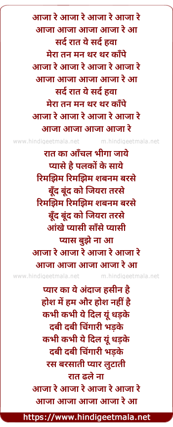 Lyrics of Aaja Re Sard Rat Ye Sard Hawa - आजा रे सर्द रात ये सर्द हवा