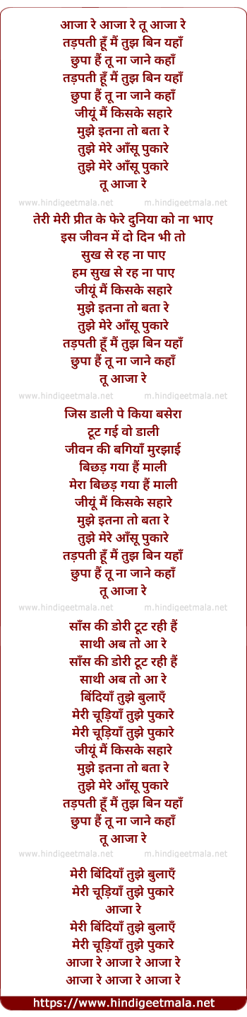 Lyrics of Aaja Re Tu Aaja Re - आजा रे तू आजा रे