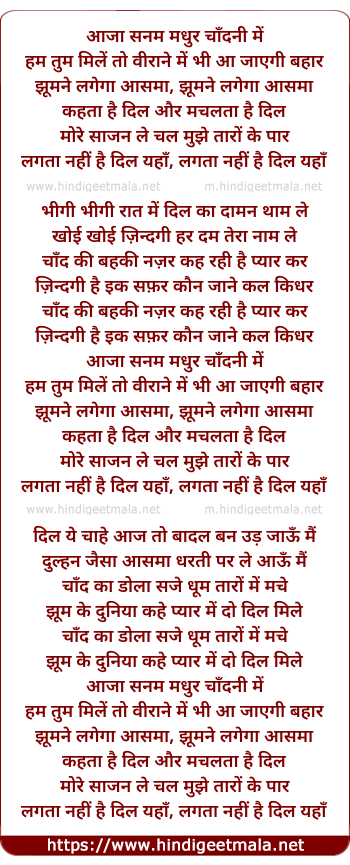 Lyrics of Aaja Sanam Madhur Chandnee Me - आजा सनम मधुर चाँदनी में