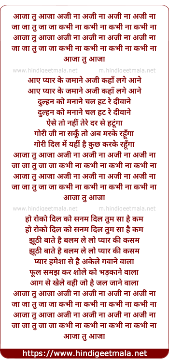Lyrics of Aaja Tu Aaja Aji Na - आजा तु आजा अजी ना