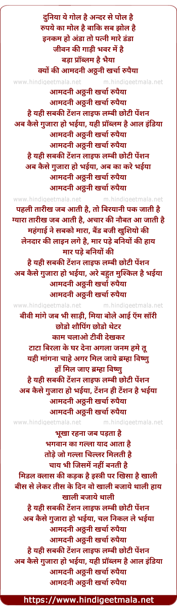 Lyrics of Aamadani Athanni Kharchaa Rupaiyaa - आमदनी अठ्ठनी खर्चा रुपैया