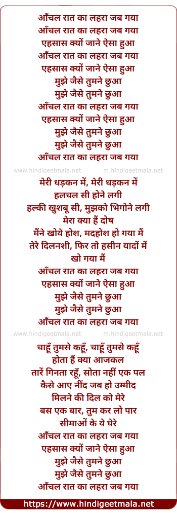 Lyrics of Aanchal Rat Ka Lehra Jab Gaya - आँचल रात का लहरा जब गया