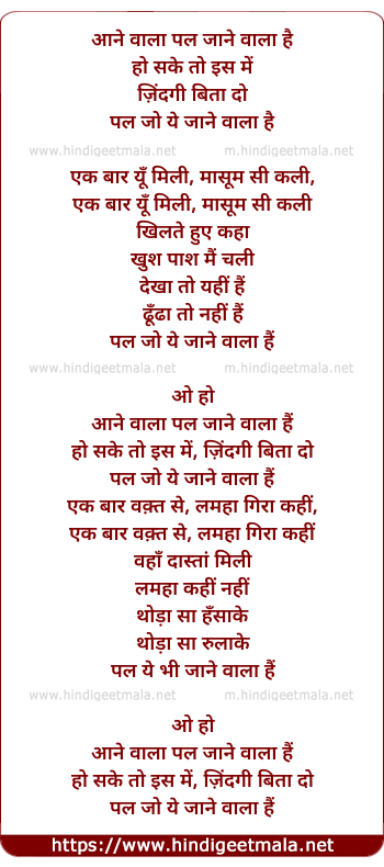 Lyrics of Aanewala Pal Jane Wala Hai - आने वाला पल जाने वाला है