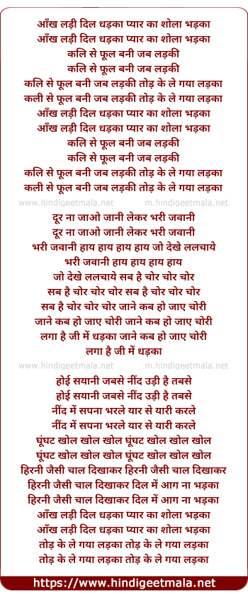Lyrics of Aankh Ladi Aur Dil Dhadka - आँख लड़ी और दिल धड़का