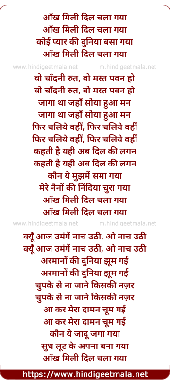 Lyrics of Aankh Milee Dil Chala Gaya - आँख मिली दिल चला गया