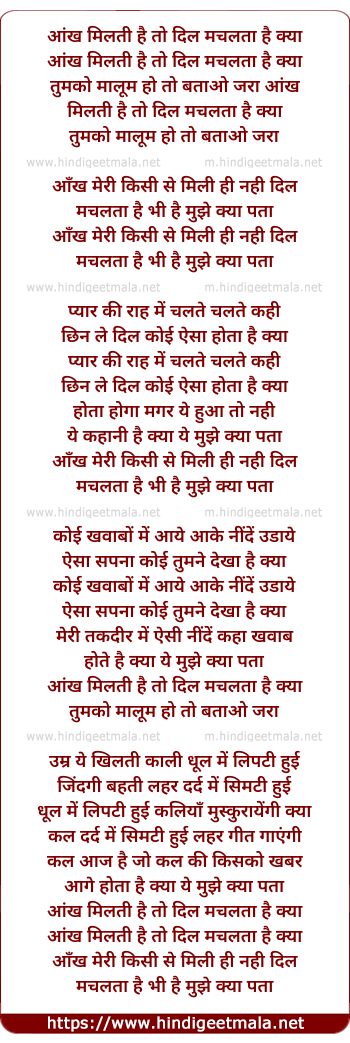 Lyrics of Aankh Milti Hai To Dil Machalta Hai Kya - आंख मिलती है तो दिल मचलता है क्या