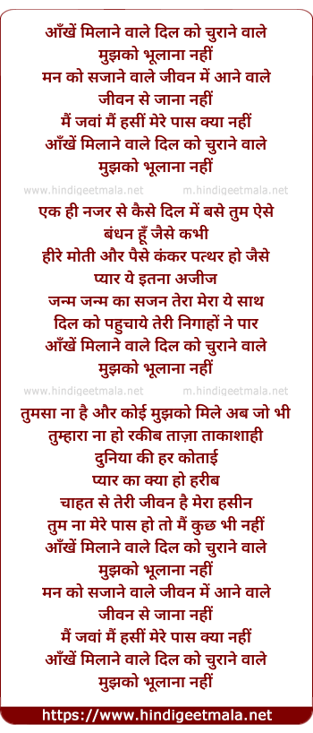 Lyrics of Aankhein Milaane Wale - ऑंखें मिलाने वाले दिल को चुराने वाले
