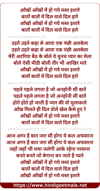 Lyrics of Aankho Aankho Me Ho Gaye Mast Ishare - आँखों आँखों में हो गये मस्त इशारे
