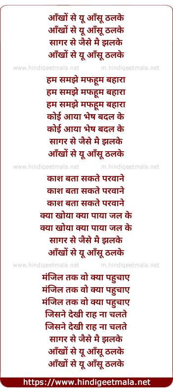 Lyrics of Aankho Se Yu Aansu Dhalke - आँखों से यू आँसू ठलके