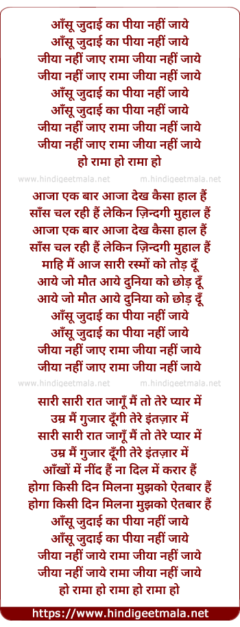 Lyrics of Aansoo Judai Kaa - आँसू जुदाई का