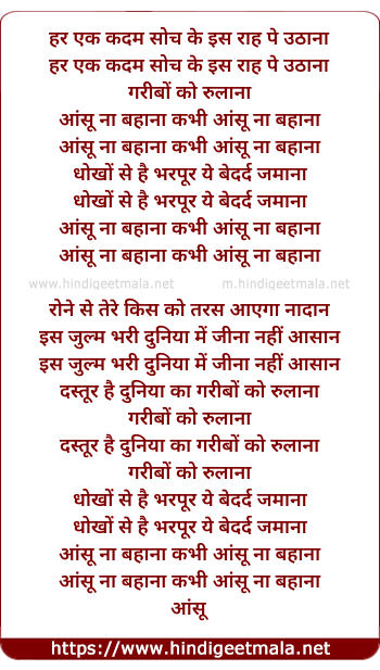 Lyrics of Aansu Na Bahana - हर एक कदम सोच के इस राह पे उठाना