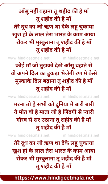 Lyrics of Aansu Nahi Bahana Tu Shahid Ki Hai Maa - आँसू नहीं बहाना तू शहीद की है माँ