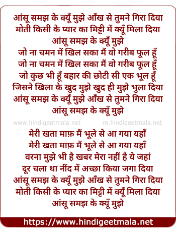 Lyrics of Aansu Samajh Ke Kyo - आंसू समझ के क्यूँ मुझे आँख से तुमने गिरा दिया