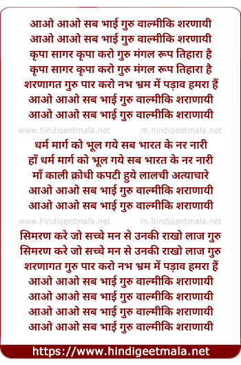 Lyrics of Aao Aao Sab Bhai - आओ आओ सब भाई गुरु वाल्मीकि शरणायी