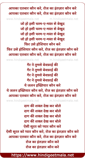Lyrics of Aap Ka Aitbaar Kaun Kare - आपका एतबार कौन करे, रोज का इंतज़ार कौन करे