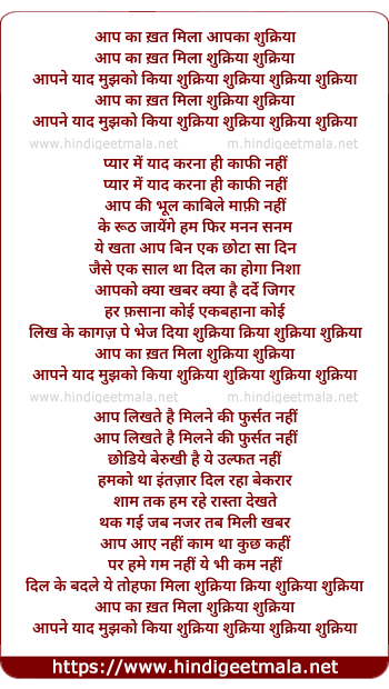 Lyrics of Aap Ka Khat Mila Aap Ka Shukriya - आप का ख़त मिला आपका शुक्रिया
