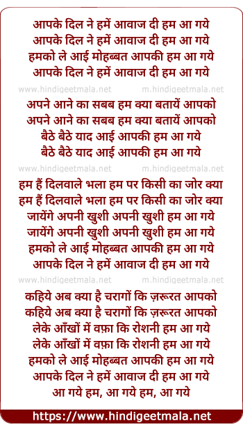 Lyrics of Aap Ke Dil Ne Hume Awaaz Di - आपके दिल ने हमें आवाज दी हम आ गये