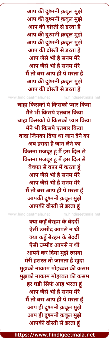 Lyrics of Aap Ki Dushmani Kabool (Duet) - आप की दुश्मनी क़बूल