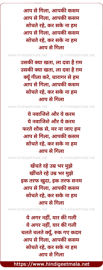 Lyrics of Aap Se Gila Aap Ki Kasam - आप से गिला, आपकी कसम